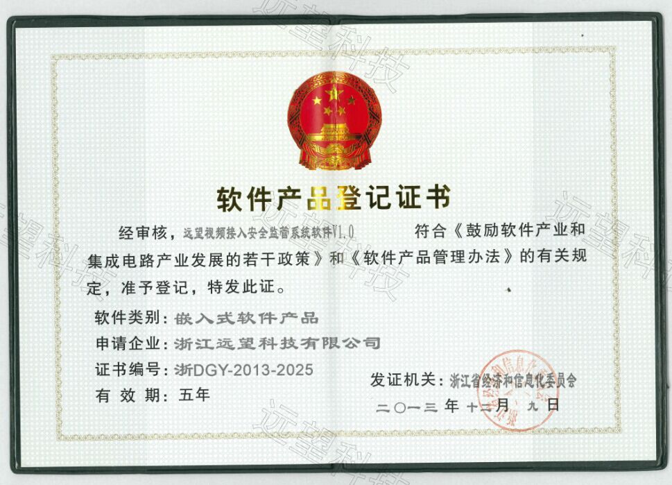 软件产品登记证书--远望视频接入安全监管系统软件V1.0